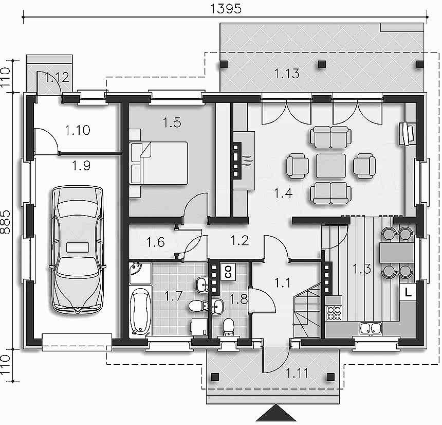 - Гараж в данном доме подойдет не только для машины, в нем можно разместить верстак и стеллажи для Пин Ап